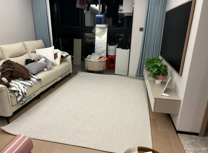 不妨想象这样一幅场景:一块硕大的地毯铺就于地面,几乎与电视柜和阳台门紧密相连,甚至对在客厅的正常行走都造成了阻碍,如此情形,岂不是令人尴尬?